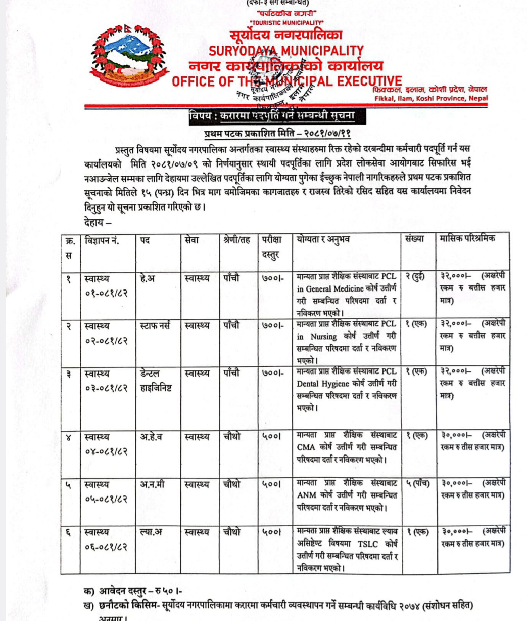 सूर्योदय नगरपालिकामा कर्मचारी आवश्यकता सम्बन्धी सूचना