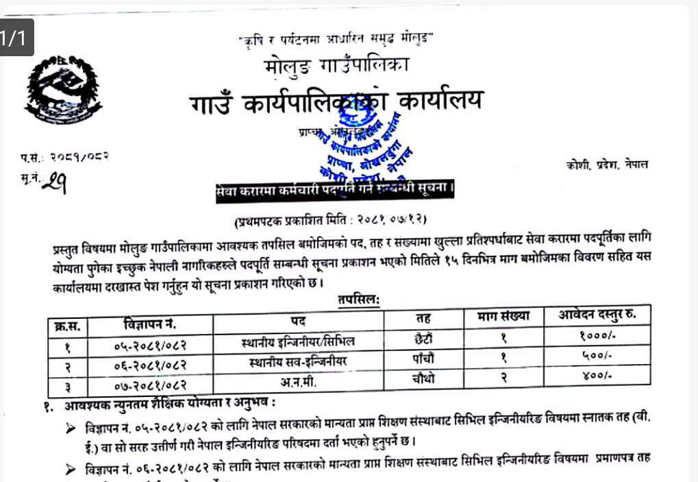 मोलुङ्ग गाउँपालिकाले माग्यो अनमी, सब इन्जिनियर, इन्जिनियर पदका लागि आवेदन