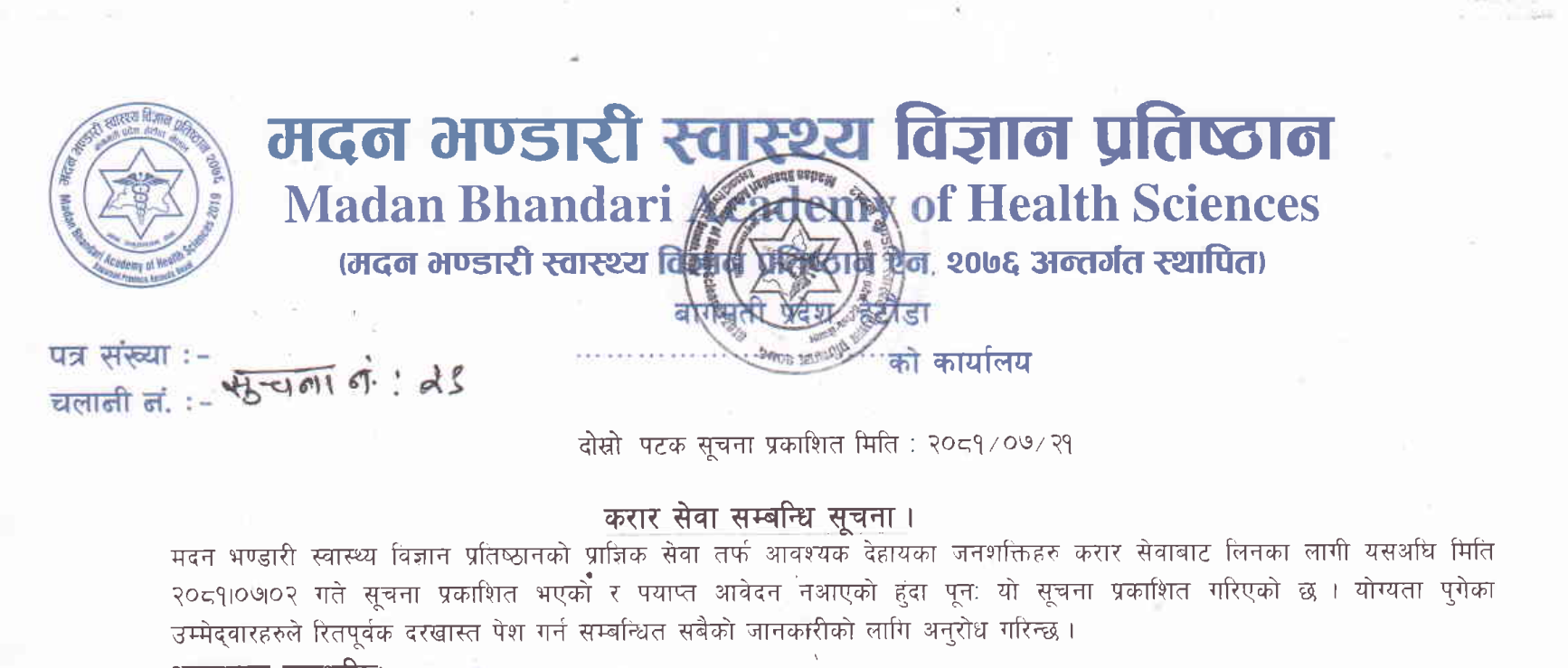 मदन भण्डारी स्वास्थ्य विज्ञान प्रतिष्ठानमा कर्मचारी आवश्यकता सम्बन्धी सूचना