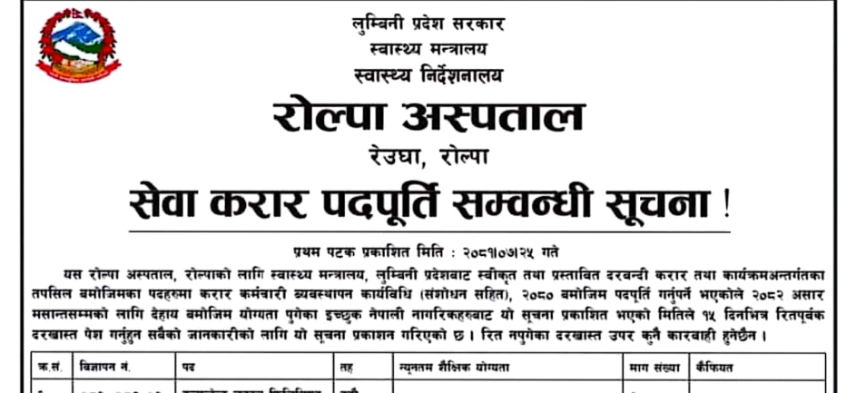 रोल्पा अस्पताल, रेउघामा २८ जना कर्मचारी आवश्यकता सम्बन्धी सूचना