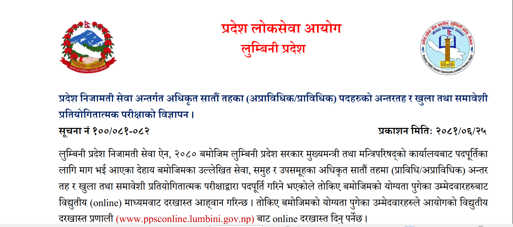लुम्बिनी प्रदेश लोक सेवा आयोगको प्रदेश निजामती सेवा अन्तर्गत अधिकृत सातौं तहका (अप्राविधिक/प्राविधिक) पदहरुको अन्तरतह र खुला तथा समावेशी प्रतियोगितात्मक परीक्षाको विज्ञापन