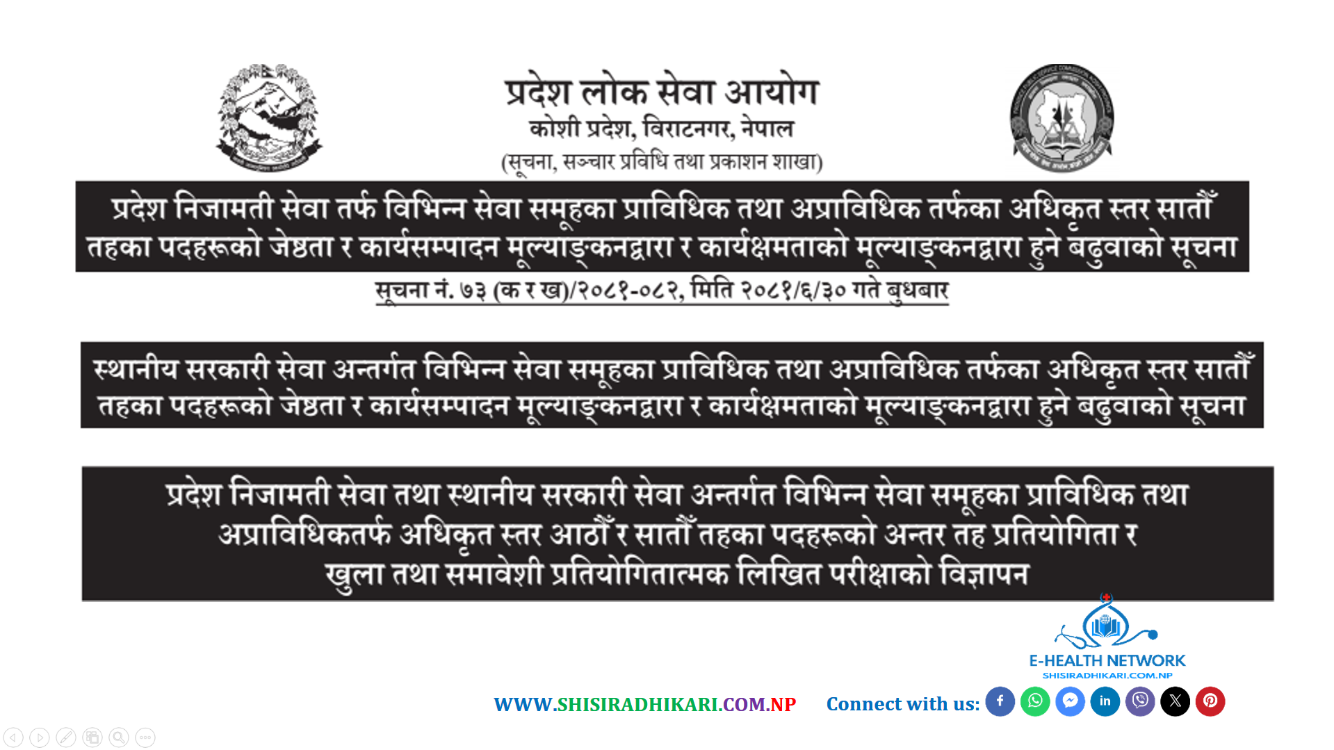 कोशी प्रदेश लोक सेवा आयोगको प्रदेश निजामती सेवा अन्तर्गत प्राविधिक तथा अप्राविधिक अधिकृत आठौं र सातौँ तह स्वास्थ्य सेवा लगायतका विभिन्न सेवाका पदहरुको विज्ञापन