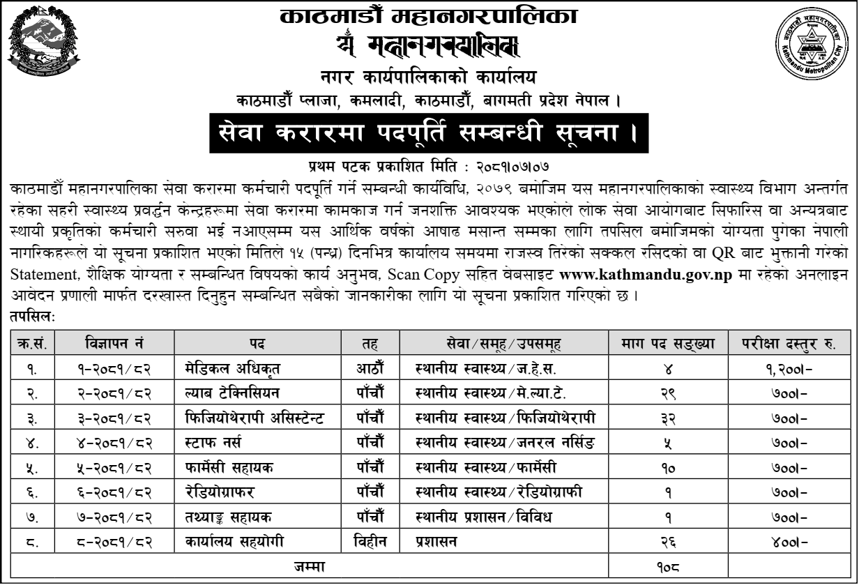काठमाण्डौं महानगरपालिकामा स्वास्थ्यकर्मी सहित १०८ जना कर्मचारी आवश्यकता