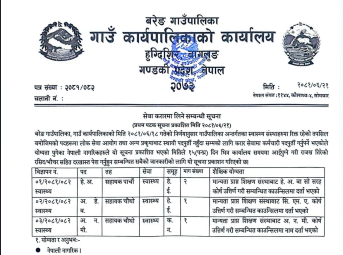 बरेङ गाउँपालिकामा हे.अ., अ.हे.व., अ.न.मी. आवश्यकता सम्बन्धी सूचना !