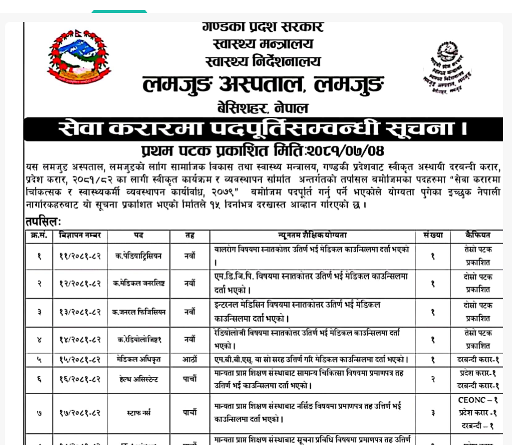 लमजुङ अस्पताल लमजुङमा कर्मचारी आवश्यकता सम्बन्धी सूचना!