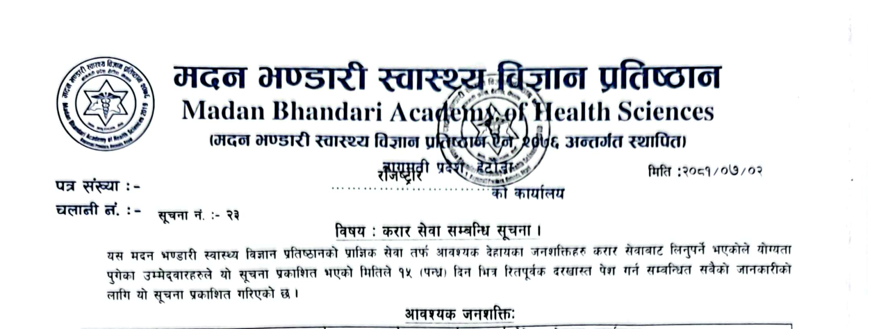 मदन भण्डारी स्वास्थ्य विज्ञान प्रतिष्ठानमा करार सेवामा कर्मचारी आवश्यकता सम्बन्धि सूचना