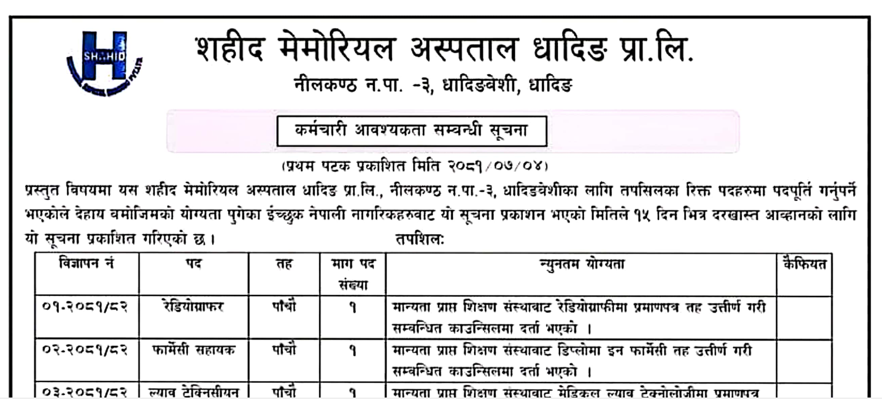 Job Vacancies For Various Positions At Sahid Memorial Hospital