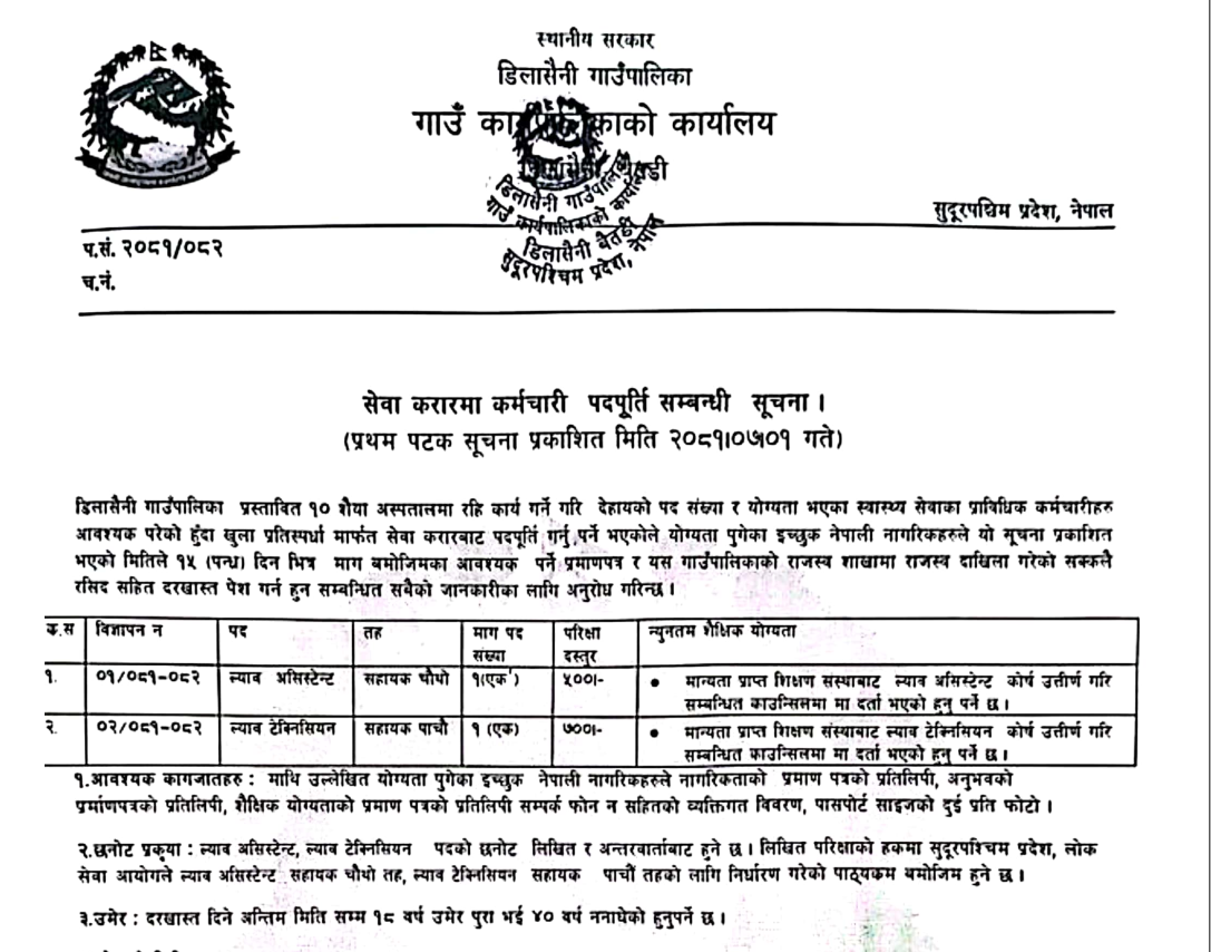 डिलासैनी गाउँपालिका बैतडीमा स्वास्थ्य कर्मचारी आवश्यकता सम्बन्धी सूचना