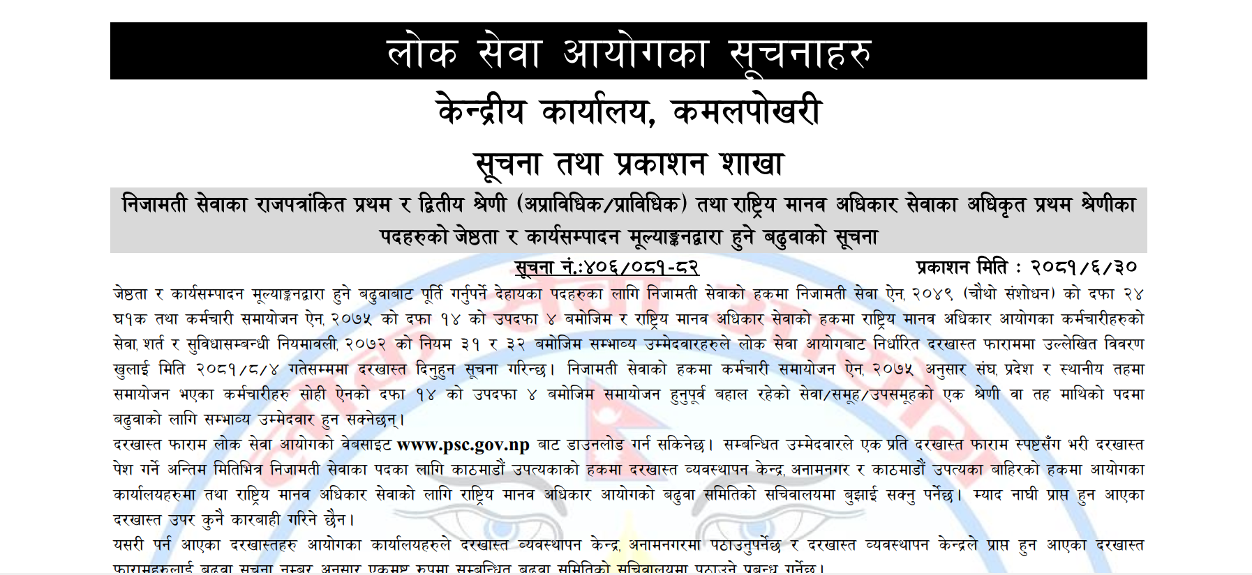 निजामती सेवा र संघीय संसद सेवाका राजपत्रांकित प्रथम र द्वितीय श्रेणी, स्वास्थ्य सेवाका एघारौं र नवौं तह तथा राष्ट्रिय मानव अधिकार सेवाका अधिकृत प्रथम/द्वितीय श्रेणीका पदको विज्ञापन