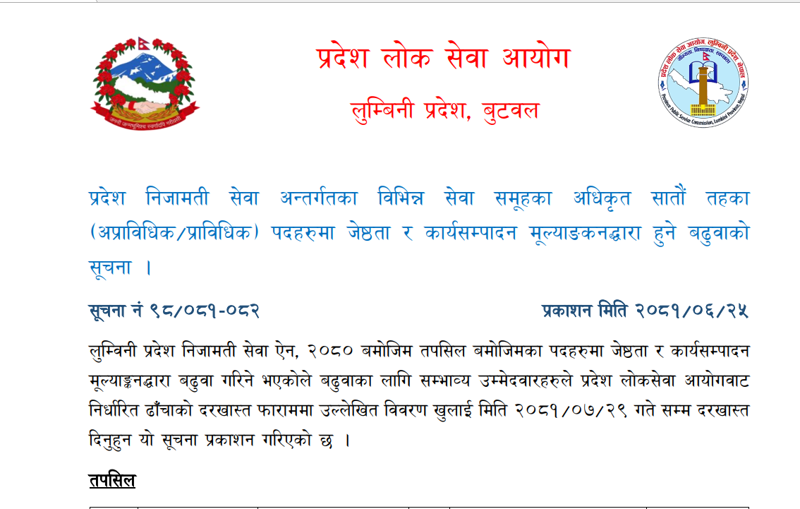 लुम्बिनी प्रदेश लोक सेवा आयोगको प्रदेश निजामती सेवा अन्तर्गतका विभिन्न सेवा समूहका अधिकृत सातौं तहका (अप्राविधिक/प्राविधिक) पदहरुमा जेष्ठता र कार्यसम्पादन मूल्याङकनद्धारा हुने बढुवाको सूचना !