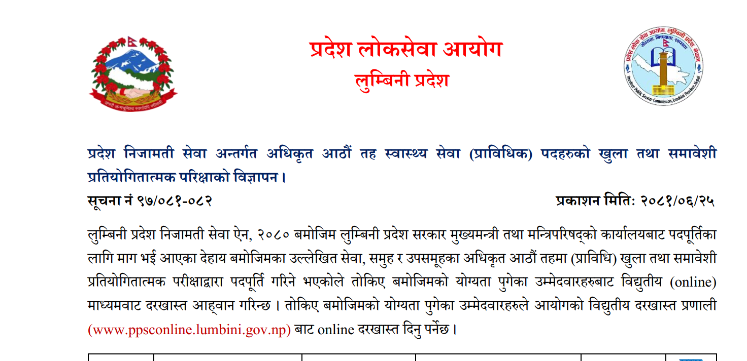 लुम्बिनी प्रदेश लोक सेवा आयोगको प्रदेश निजामती सेवा अन्तर्गत अधिकृत आठौं तह स्वास्थ्य सेवा (प्राविधिक) पदहरुको खुला तथा समावेशी प्रतियोगितात्मक परीक्षाको विज्ञापन ।