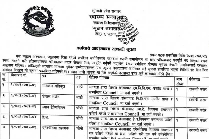 प्युठान अस्पतालमा स्वास्थ्य कर्मचारी आवश्यकता
