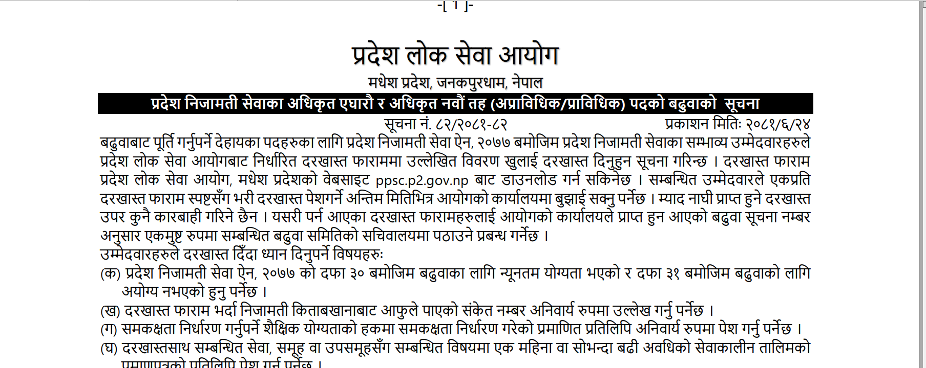 मधेश प्रदेश प्रदेश लोक सेवा आयोगको प्रदेश निजामती सेवाका अधिकृत एघारौं र अधिकृत नवौं तह (अप्राविधिक/प्राविधिक) पदहरुको बढुवा, खुला तथा समावेशीको विज्ञापन २०८१-८२