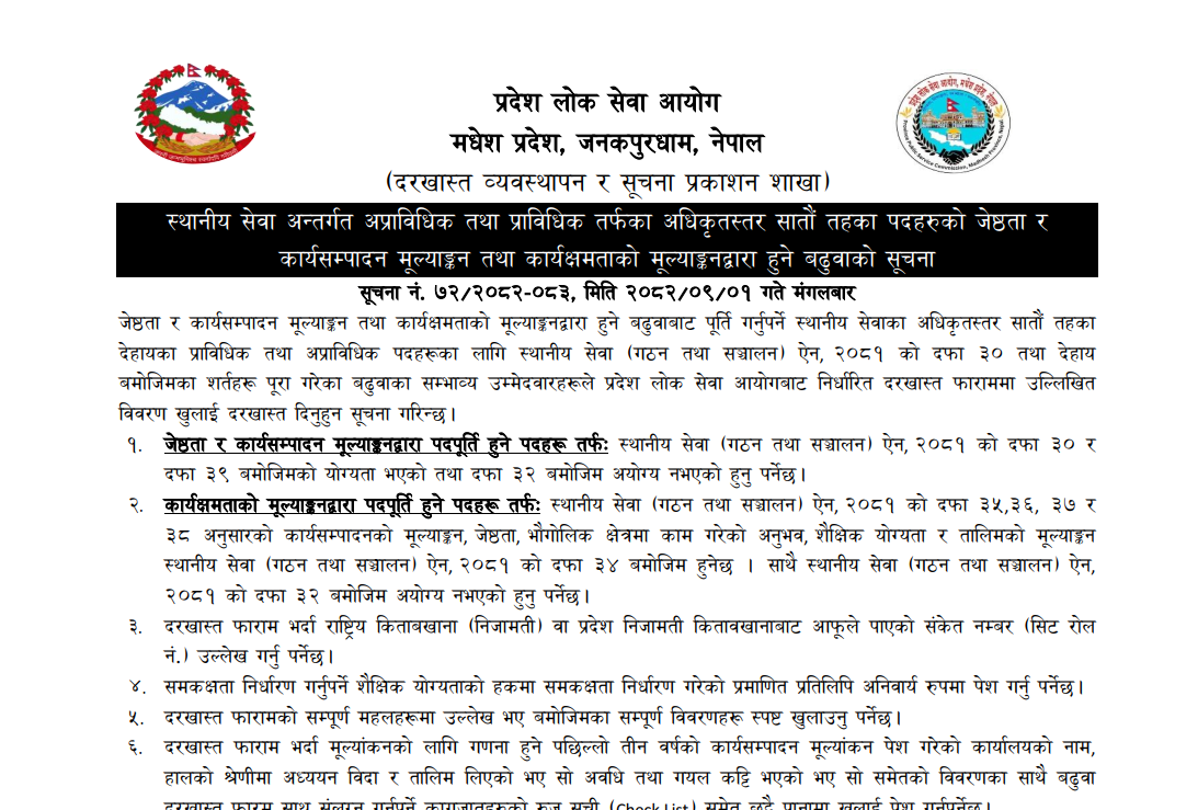 मधेश प्रदेश लोक सेवा आयोगको अधिकृतस्तर सातौ तहका पदहरुको बढुवा खुला तथा समावेशी र अन्तर तहको विज्ञापन