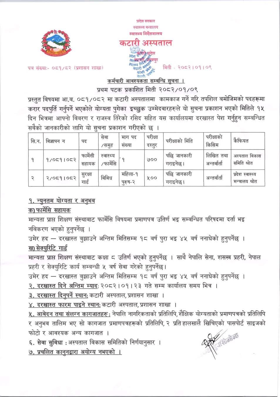 Katari Hospital Vacancy for Pharmacy Assistant and Security Guard